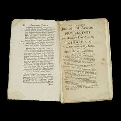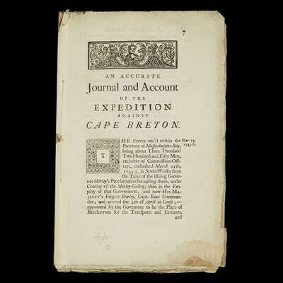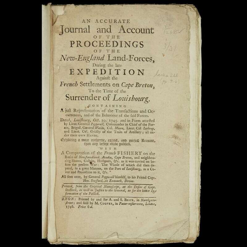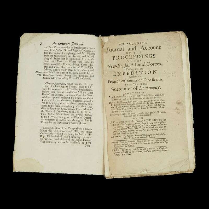 (Americana : Military History) (Pepperell, Sir William.) An Accurate Journal and Account of the Proceeding of the New-England Land-Forces, During the late Expedition Against the French Settlements on Cape Breton, To the... Surrender of Louisbourg. Exon [Exeter]: A. and S. Brice...; [for] M. Cooper, 1746. First edition.