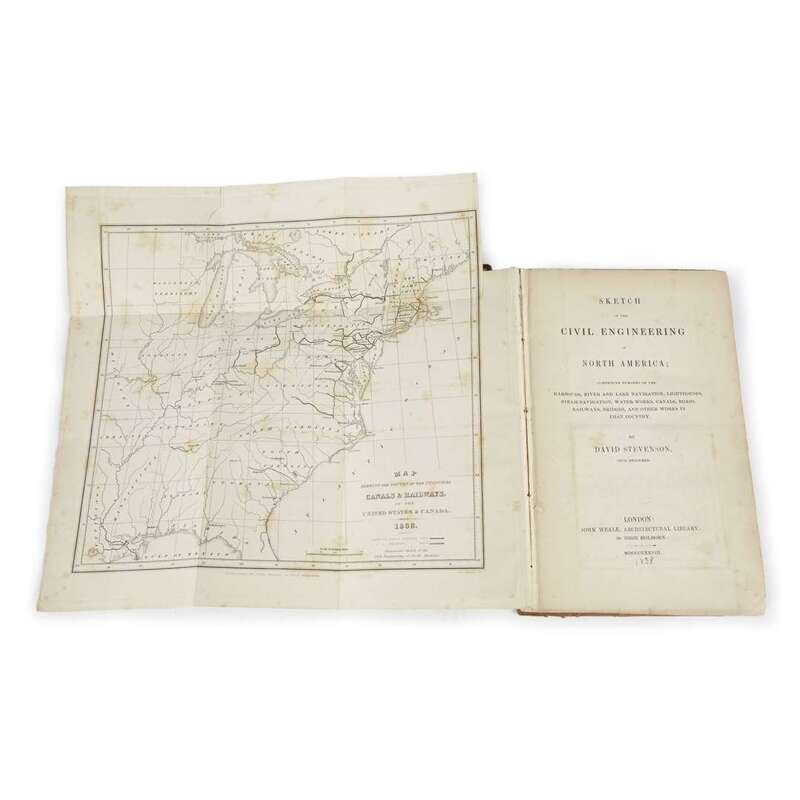 (Americana : Industry) 1 Vol. Stevenson, David. Sketch of the Civil Engineering of America. London: John Weale, 1838. First edition. 8vo, original cloth; spine gone, binding broken. With folding map, 2 plates + 12 diagrams. A few small tears and generally light foxing to map, scattered, light internal foxing, offsetting on title page. 8 p. advertisements at back. Untrimmed. Ink and pencil annotations on half title. Ex-library ink stamp on verso of title, label on front paste down.