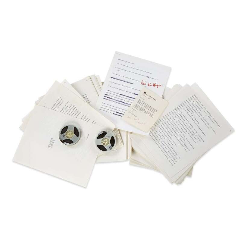 (African-Americana) Lot. (Baldwin, James; Haley, Alex; Goode, Jim.) File of typescripts and reel to reel audio tapes. Interview conducted with James Baldwin by Jim Goode (Playboy Magazine's Articles editor, creator of the Playboy Interview), ca. December, 1967. 170 p. typescript on 170 4to sheets; with 2 reel to reel audio tapes. Apparently submitted to Alex Haley for review. Unpublished(?)