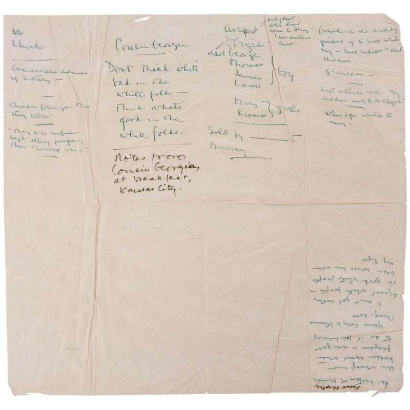 (African-Americana) 1 Piece. (Autograph material.) (Haley, Alex.) (Kansas City, Kansas), (1965). Manuscript notes on unfolded pink napkin, 13 x 12 3/4 inches; 330 x 323 mm. Recording fragments of an oral family history recounted by an elderly relative (Cousin Georgia) relating to the early generations of the families' enslaved African and African-American ancestors; accounts incorporated in Alex Haley's novel Roots, published in 1976.