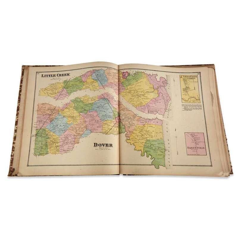 (Maps & Atlases : American Subjects) 1 Vol. Beers, Daniel G. Atlas of the State of Delaware. Philadelphia: Pomeroy & Beers, 1868. Folio, original cloth and boards, morocco cover label; spine defective, covers detached but present. With 38 color maps. Internally generally clean. Bottom fore edge corner of title page, front matter, and Delaware state map creased and a little chipped. First atlas of the State of Delaware.
