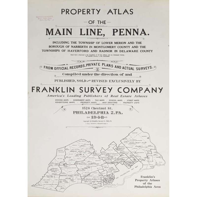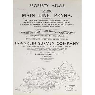 (Maps & Atlases : American Property Atlases) 1 Vol. Franklin Survey Company, publisher. Property Atlas of the Main Line, Pennsylvania. Philadelphia, 1948. Folio, original cloth; wear to corners. With 4 preliminary maps (including Index map) and tables + 30 double-page colored maps. Complete with tabs. Internally clean and crisp.