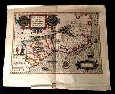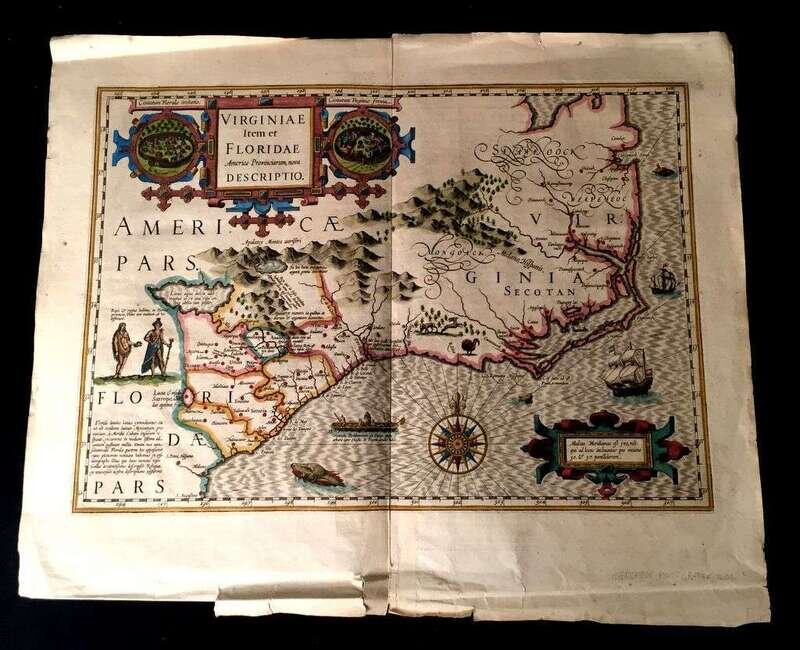 (Maps & Atlases: American Subjects) 1 Piece. Hand-colored Engraved Map. Hondius, Jodocus. "Virginiae Item et Floridae Americae Provinciarum nova Descriptio." (Amsterdam), (1613). 13 1/2 x 19 3/16 inches; 343 x 487 mm, full margins. Some creasing to margins, a few small tears at edges of margins, light crease along center fold, very light scattered foxing, slightly dusty, lightly toned. French text on verso. Old hand color.