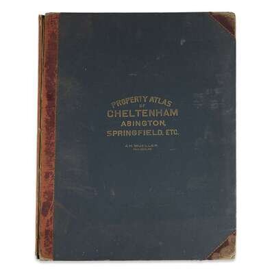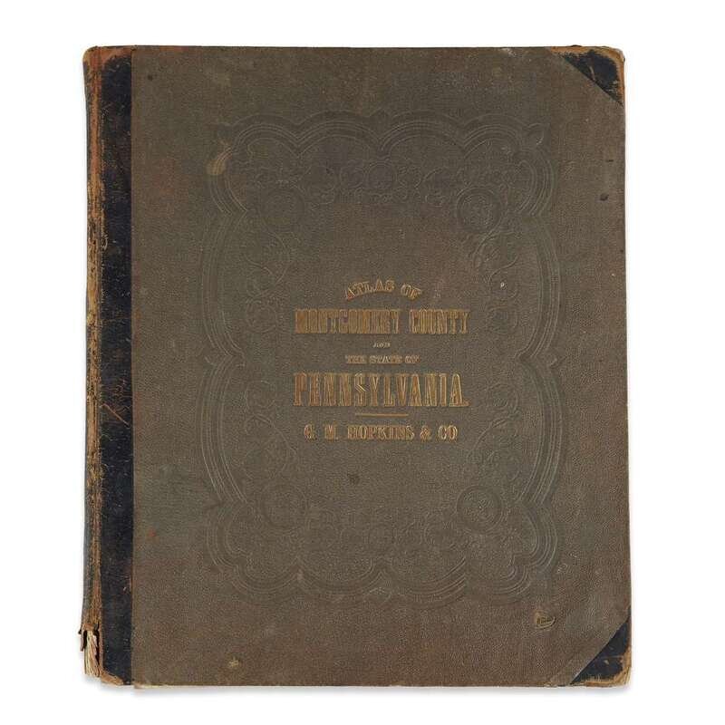 (Maps & Atlases : American Subjects) 2 Vols. Pennsylvania Atlases: Hopkins, G. M., publisher. Atlas of the County of Montgomery and the State of Pennsylvania. Philadelphia, 1871. Square folio, original gilt-lettered cloth, morocco spine and corners; morocco rubbed, light wear to cloth. Complete with 36 color maps. Internally generally clean. Darkening and wear to edges of last folding map. Minor damp wrinkling to endpapers. Le Gear L3046. * Mueller, A. H., publisher. Atlas of Properties on the Reading Railroad embracing Cheltenham, Abington, Springfield and Parts of Moreland and Whitemarsh Townships. Philadelphia, 1909. Folio original gilt-lettered cloth, morocco spine and corners; morocco heavily rubbed, cloth a little scuffed. With Index map + 21 double-page color maps. Chipping to endpapers, some internal dust smudging.