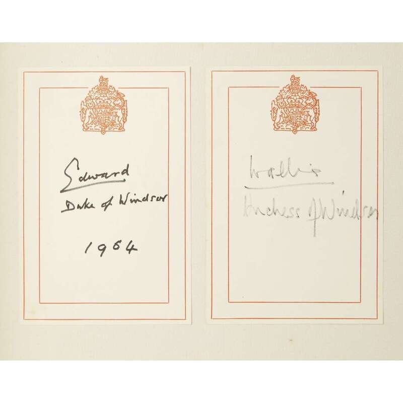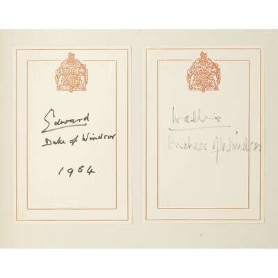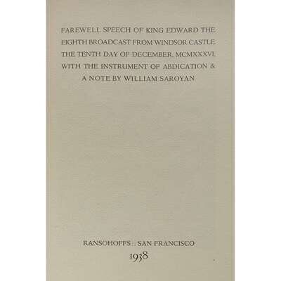 (Bindings) 1 Vol. Windsor, Edward, Duke of. Farewell Speech of King Edward the Eighth Broadcast from Windsor Castle... With the Instrument of Abdication. San Francisco: Ransohoffs (by the Grabhorn Press), 1938. 1/200. Folio, original half-white pigskin and color armorial beige cloth, untrimmed edges; spine slightly scuffed and starting to darken, some light edge wear. With a colored wood-engraving by Mallette Dean, and a "note" by William Saroyan. Printed in gold and black. With 2 armorial labels on front free endpaper recto; one signed and dated, "Edward/Duke of Windsor/1964" and the other signed, "Wallis/Duchess of Windsor."