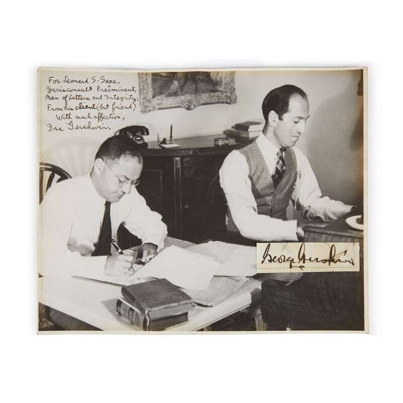 (Performing Arts & Music) 1 Piece. Photograph Signed and Inscribed. Gershwin, Ira. No place, ca. 1950s. Silver print, 8 x 10 inches, 203 x 254 mm. Inscribed to Leonard Spier Saxe (family relation and legal representative). With mounted cut signature of George Gershwin. Photo depicts George and Ira seated at work - George at the piano, Ira with pen in hand. Minor creasing to photo.