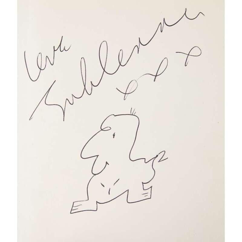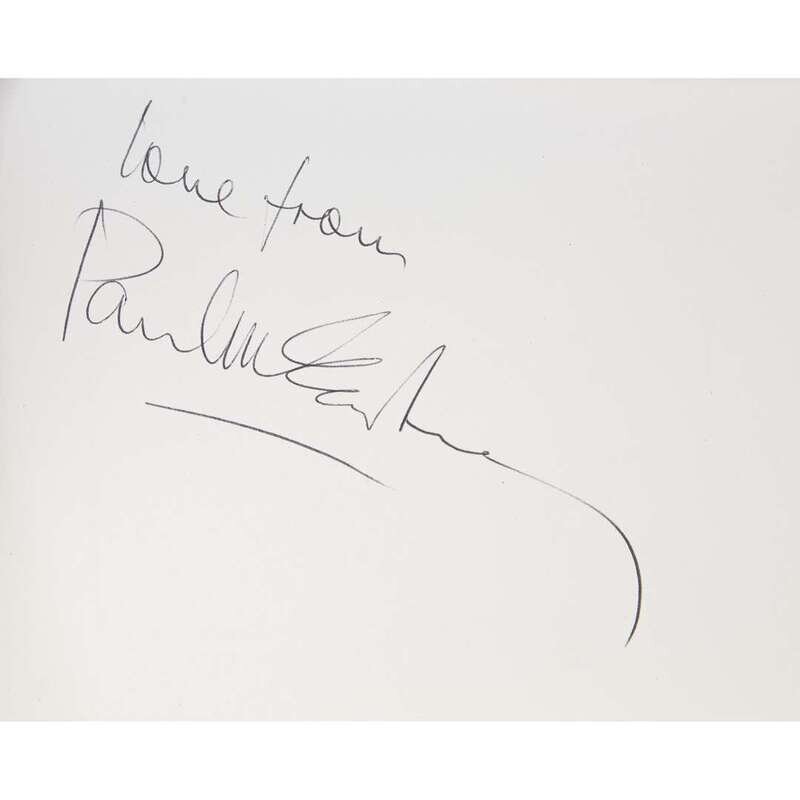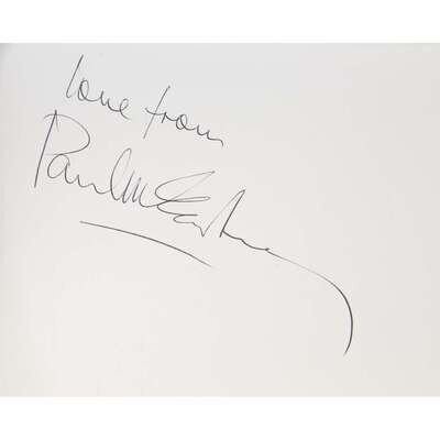 (Performing Arts & Music) 1 Vol. Lennon, John. In His Own Write. London: Jonathan Cape, (1964). Fourth printing. 12mo, original pictorial laminated boards, occasionally very slightly scuffed. Illustrated. Internally crisp and clean. Signed and embellished with an ink drawing on the front free endpaper recto by John Lennon; also signed and inscribed "love / Paul McCartney" in ink on front blank recto by Paul McCarthy.