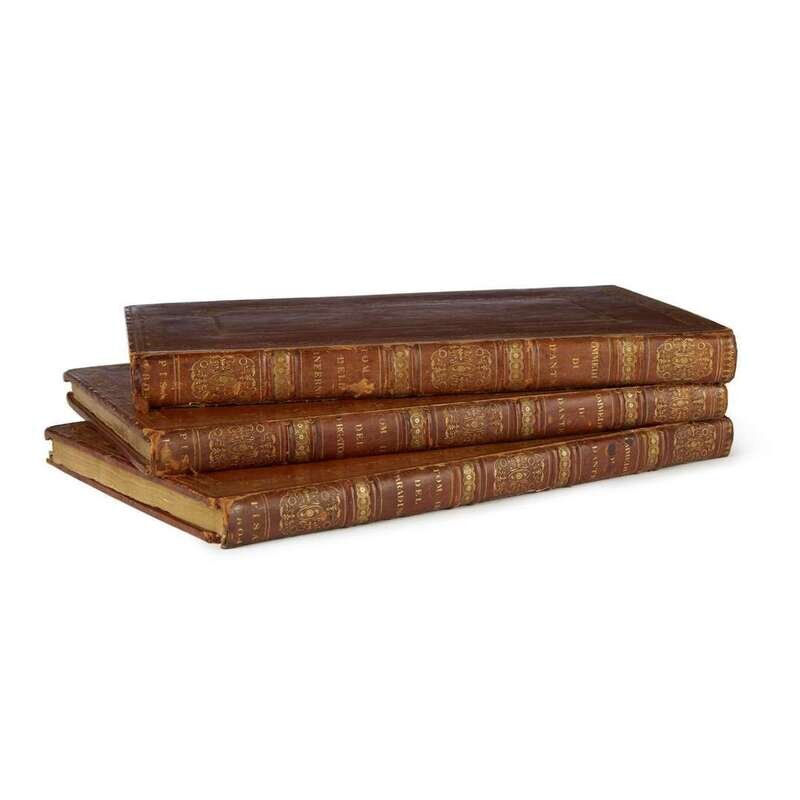 3 vols. of 4 (wanting i.e. Vita di Dante Alighieri and Indices). Folio, contemporary full gilt paneled and foliate tan calf, gilt spine compartments, turn ins with gilt geometrical foliage corners, goffered gilt edges; joints and extremities rubbed, other scattered wear to bindings, front covers of vols. 1 and 3 detached (but present). Frontispiece portraits (2), including portrait of Dante engraved by Raphael Morghen. Scattered light foxing. With the armorial book plates of [Lord] Leigh (of Stoneliegh Abbey) on pastedowns.