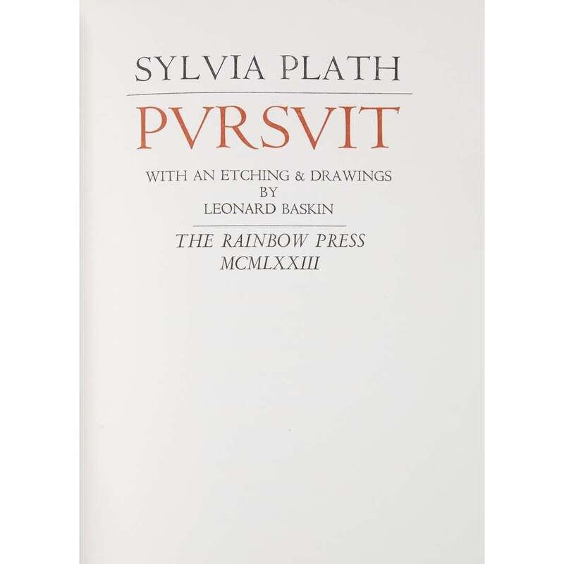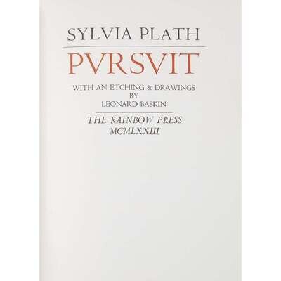 (Illustrated & Private Press) 1 Vol. (Baskin, Leonard, illustrator.) Plath, Silvia. Pursuit. (London): Rainbow Press, 1973. 1/100. 4to, original full dark green crushed morocco, gilt-lettered spine, top edges gilt, other edges untrimmed, by Zaehnsdof; minor wear, green cloth slipcase. With original etching signed and numbered "79/100," in pencil by Leonard Baskin laid in.