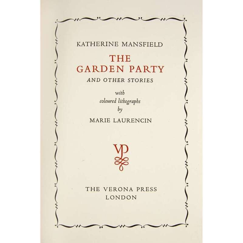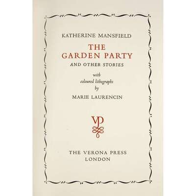 (Illustrated & Private Press) 1 Vol. (Laurencin, Marie, illustrator.) Mansfield, Katherine. The Garden Party and other stories. London: Verona Press, (1939) [1947]. #97/1,200. Large 8vo, original white-decorated green boards, orange morocco spine label, fore and bottom edges untrimmed; minor wear, dust jacket (very minor occasional edge wear, a few small spots and one small blister to spine panel). With 16 color lithographic illustrations by Marie Laurencin. Early owner's Christmas gift presentation dated 1948 on front free endpaper recto, but internally clean. Printed in 1939, but issued in 1947. Bright, tight copy with attractive original dust jacket in original slipcase (joints starting to split).