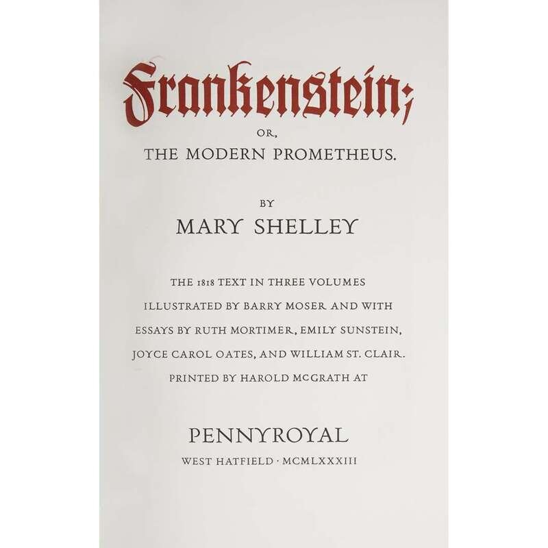 (Illustrated & Private Press) 1 Vol. (Pennyroyal Press.) Shelly, Mary Wollstonecraft. Frankenstein, or the Modern Prometheus. West Hatfield, 1983. Illustrated by Barry Moser. #216/350 signed by Barry Moser. Folio, original half tan crushed morocco and burgundy cloth, spine gilt, top edges gilt, burgundy morocco spine label. With 52 full page wood engraved illustrations, and with an additional suite of 52 wood engraved plates, each signed by Barry Moser, loose in a burgundy cloth chemise. All housed in original burgundy cloth chemise. Near Fine/Fine.