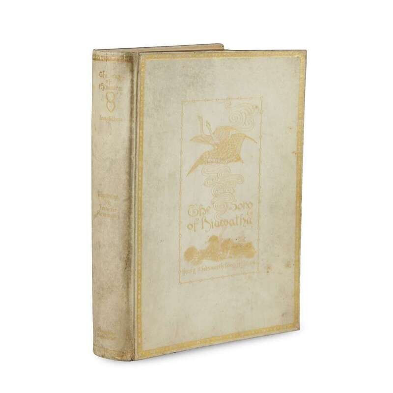 (Illustrated & Private Press) 1 Vol. (Remington, Frederic, illustrator.) Longfellow, Henry Wadsworth. The Song of Hiawatha. Boston: Houghton Mifflin, 1891. #188/250. Printed at the Riverside Press. 4to, original gilt-pictorial and decorated white vellum over boards, top edges gilt; ocassionally scuffed, scattered minor dust smudging. With frontispiece portrait + 22 photogravure plates with lettered tissue guards, shoulder illustrations throughout. Page (iii)/iv loose. Internally clean. Bookplate of James W. Ellsworth on front pastedown, ownership label on front free endpaper recto.