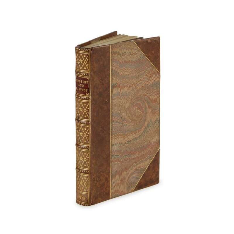 (Illustrated & Private Press) 1 Vol. (Sherwood, Mary Martha.) Seedtime and Harvest. Wellington, Salop; London: Houlston and Son, 1829. 12mo, later 19th-century polished calf and marbled boards, gilt, richly gilt spine compartments, morocco spine label; occasionally slightly scuffed, original hand colored printed pink wrappers preserved. Hand-colored engraved frontispiece. OCLC 84442669 - 1 copy. Bound with: (Cameron, Mrs.) The History of Fidelity and Profession. Wellington, Salop; London: Houston and Son, 1826. "Seventh Edition." 12mo, original blue printed wrappers preserved. Hand-colored engraved frontispiece. OCLC 11610694. Contents generally clean and crisp in both titles.