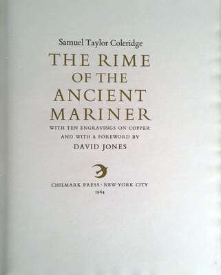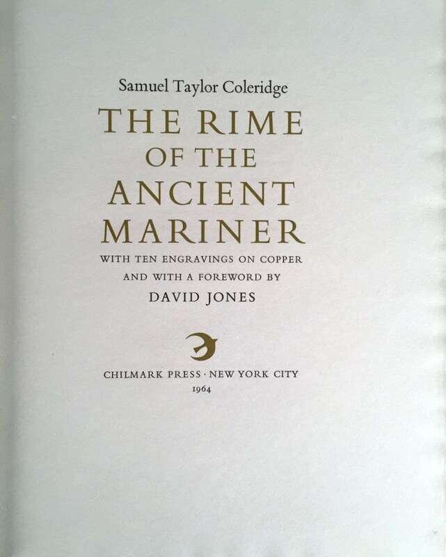 (Literature) 1 Vol. (Chilmark Press.) Coleridge, Samuel Taylor. The Rime of the Ancient Mariner. New York, 1964. #67/200 (of 315). 4to, original green cloth, gilt-lettered spine, top edges gilt, other edges untrimmed; light, faint, wear to edges and joints, slipcase (light to moderate wear to joints and edges). With 10 engravings on copper by David Jones. Internally crisp and clean. Prospectus inserted.