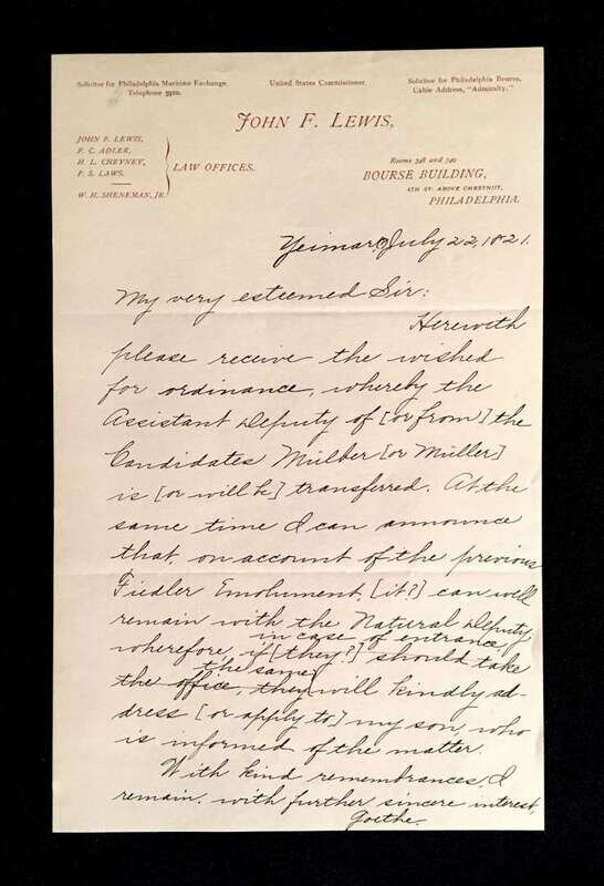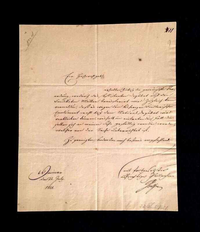 (Literary Autographs). 2 pieces. (Goethe, Johann Wolfgang von). Documents Signed: Weimar, Germany: 22 July, 1821. Letter in secretarial hand, closed by Goethe's bold and clear signature. Discusses matters of publishing and accounting to be addressed by his son. * Document signed, (n.p., n.d.) Written in secretarial hand(s), with Goethe's marginal notations and concluding remarks in pencil. Initialed in pencil, crossed-out in brown ink.