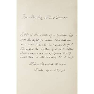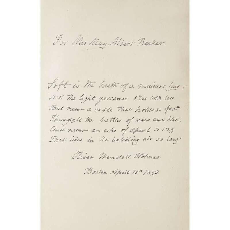 With holograph six line verse quotation dated "Boston, April 13th 1893," "For Mrs. Mary Albert Barker," signed by Oliver Wendell Holmes. Strong and clear in ink on front fly recto. Quotation constituting the first six lines of the stanza of "Dorothy Q" beginning, "Soft is the breath of a maiden's YES:"