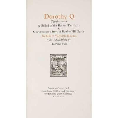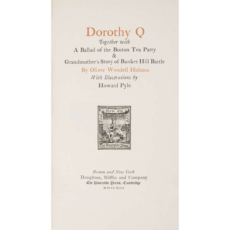 (Literature) 1 Vol. Holmes, Oliver Wendell. Dorothy Q, Together with A Ballad of the Boston Tea Party & Grandmother's Story of Bunker Hill Battle. Boston & New York: Houghton, Mifflin, 1893. First edition. Small 8vo, original silver lettered and decorated olive/grey cloth, top edge silver, other edges untrimmed, light edge wear, occasionally slightly scuffed. Illustrated by Howard Pyle, complete with frontispiece and full-page illustrations. Ink ownership on back of frontispiece. Internally generally clean. Bookplate of Granville Barker on front free endpaper. In custom black quarter morocco, gilt, and green cloth slipcase, and chemise.