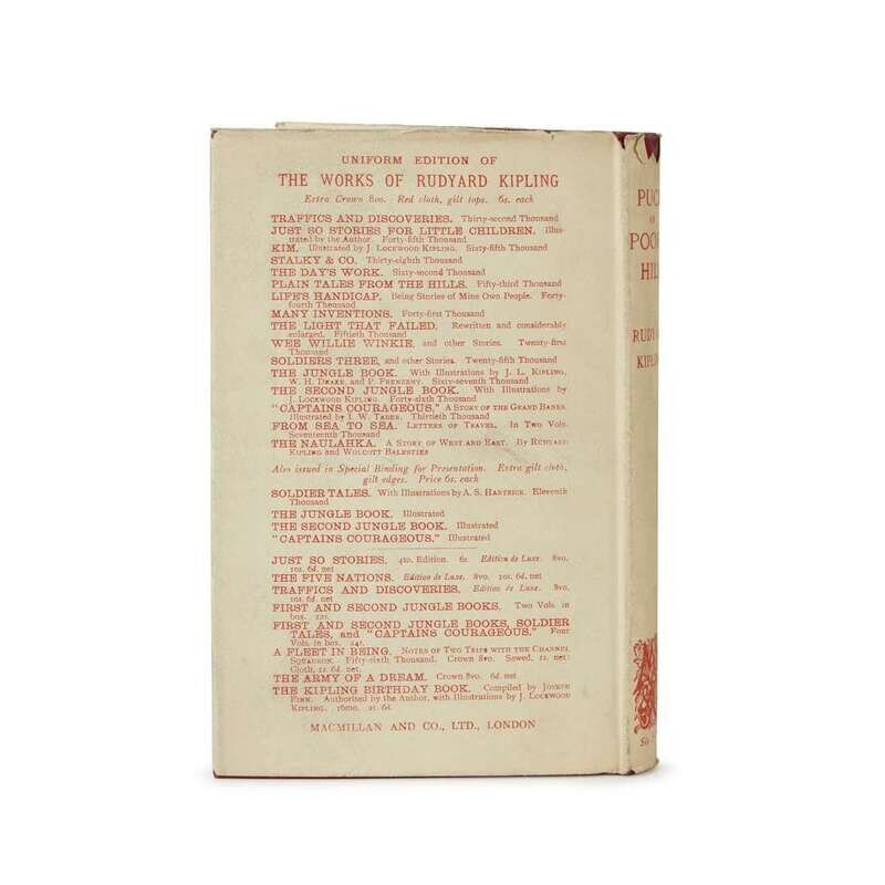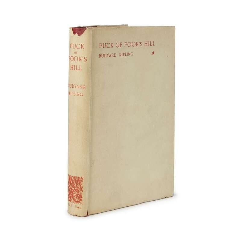 (Literature) 1 Vol. Kipling, Rudyard. Puck of Pook's Hill. London: Macmillan, 1906. First English edition. 8vo, original burgundy cloth, gilt, top edges gilt; minor wear; dust jacket (minor chipping at edges). Exceptionally tight, bright copy in well-preserved original dust jacket housed in custom red morocco and cloth slipcase and chemise.
