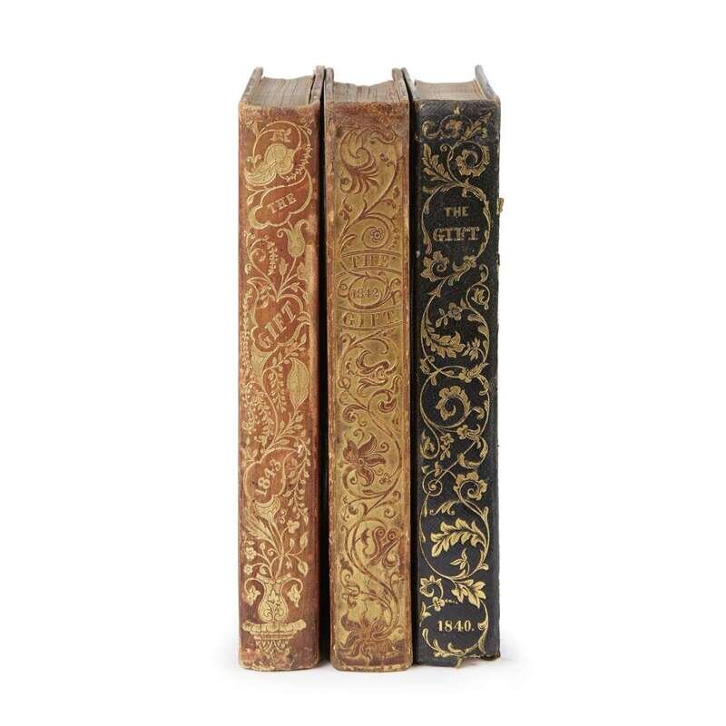 (Literature) 3 Vols. Edgar Allan Poe: Poe, Edgar A. "William Wilson." [In] The Gift: A Christmas and New Year's Present for 1840. Philadelphia: Carey & Hart, (1839). Edited by Miss Leslie. 12mo, original publisher's richly gilt black morocco, all edges gilt; joints and extremities often rubbed. Additional vignette title and 9 engraved plates, tissue guards. Scattered light-to-occasionally-moderate foxing, a little creasing and dust smudging to free endpapers. BAL 16130 (First appearance of Poe's William Wilson). * Poe, Edgar A. "Elenora." [In] The Gift: A Christmas and New Year's Present for 1842. Philadelphia: Carey & Hart, (1841). Edited by Miss Leslie. 12mo, original publisher's richly gilt tan calf, all edges gilt; joints and extremities rubbed. With additional vignette title and 8 plates, tissue guards. Moderate foxing to front and back matter and plates, other scattered light foxing, a little creasing and minor dust smudging to free endpapers. BAL 16135 (First appearance of Poe's Elenora); also includes first appearance of William Gilmore's Murder Will Out, BAL 18073. * Poe, Edgar A. "The Pit and the Pendulum." [In] The Gift: A Christmas and New Year's Present. 1843. Philadelphia: Carey & Hart, (1842). 12mo, original publisher's richly gilt tan calf, all edges gilt; scuffed, joints and extremities rubbed. With additional vignette title and 8 plates, tissue guards. Light to moderate foxing throughout, some marginal dampstaining to title page and front matter, frontispiece sprung and edge worn. BAL 16137 (First appearance of Poe's The Pit and the Pendulum).