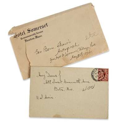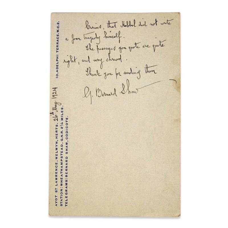 (Literary Autographs) 1 Piece. Autograph Post Card Signed. Shaw, George Bernard. Ayot St. Lawrence, May 26, 1924. To Harry Dessauer, Jr., "Curious that Habbel did not write / a Joan tragedy himself. / The passages you quote are quite / right, and very shrewd. / Thank you for sending them / G. Bernard Shaw." Addressed in Shaw's hand on mailing side. Strong hand, all clean and crisp.