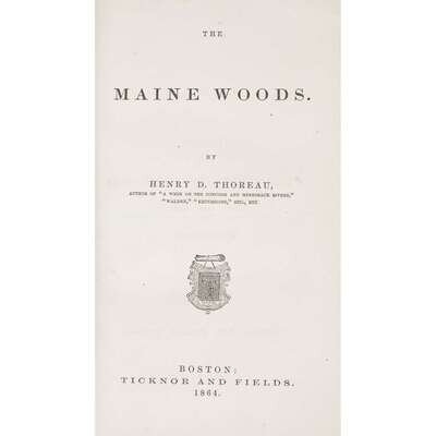 (Literature) 1 Vol. Thoreau, Henry D. The Maine Woods. Boston: Ticknor and Fields, 1864. First edition. 12mo, original green cloth, gilt-lettered spine; moderate wear, corners rubbed, covers scuffed, spine ends frayed - losses at head of spine, a few small blisters to back joint and top edge of back cover, spine gilt starting to fade. Bottoms of hinges starting to separate. With 23 (one) page publisher's advertisements, dated April, 1864, at back. Flyleaves toned, dampstain to center bottom fore edge of advertisements and last text leaf, scattered internal spotting and small dust smudging.