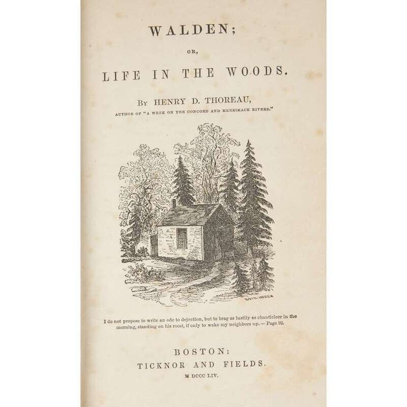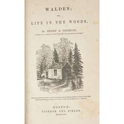 (Literature) 1 Vol. Thoreau, Henry D. Walden; or, Life in the Woods. Boston: Ticknor and Fields, 1854. First edition. 12mo, original brown cloth, blind stamped covers, gilt lettered spine; minor wear to spine ends. Yellow endpapers, fly leaves, terminal blank. With title vignette and map inserted after p. 306. Eight page publisher's advertisements, dated April, 1854, at back. Light to moderate foxing to endpapers, flyleaves and title-page, other scattered light foxing and occasional small dust smudging. Leaf size, 7 1/8 x 4 3/8 inches; 180 x 114mm. Bookseller's ticket of A Stacy, Concord Ms. at gutter foot of front free endpaper recto. In custom brown cloth clam shell box.