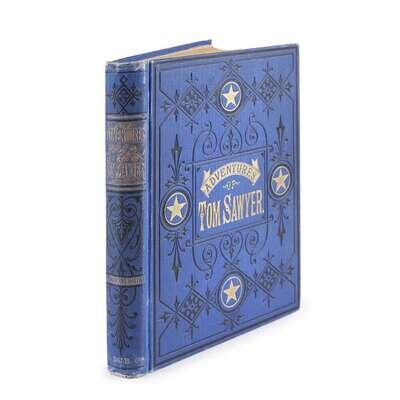 (Literature) 1 Vol. (Clemens, Samuel L.) The Adventures of Tom Sawyer by Mark Twain. Hartford, etc.: American Publishing Company, 1876. First American edition, second printing. Large 8vo, original black and gilt-stamped blue cloth; light wear, corners a little bumped, spine ends slightly scuffed and a little frayed, new paste-downs. With frontispiece and text illustrations. Scattered, light spotting, occasional small dust smudges. With four page advertisements at back, two fly leaves at front, one fly leaf at back. Free endpapers a little toned with some spotting. Leaf-size: 8 3/8 x 6 3/8 inches; 213 x 162 mm.