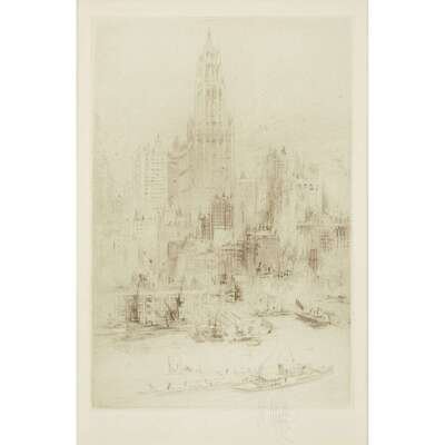 WILLIAM WALCOT (BRITISH, 1874-1943) "DOWNTOWN MANHATTAN FROM THE EAST RIVER, WITH THE WOOLWORTH BUILDING"