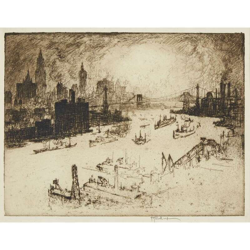 JOSEPH PENNELL (AMERICAN, 1857 - 1926) "SUNSET FROM WILLIAMSBURG BRIDGE"