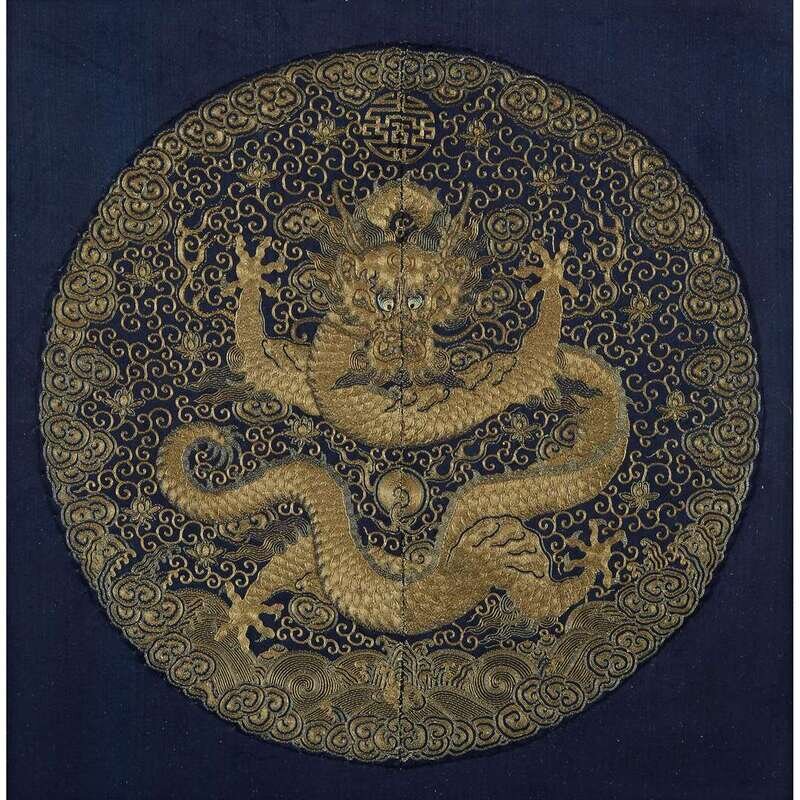 A Chinese couched gold and silver embroidered emperor's 'five-clawed dragon' roundel qianlong period, 18th century