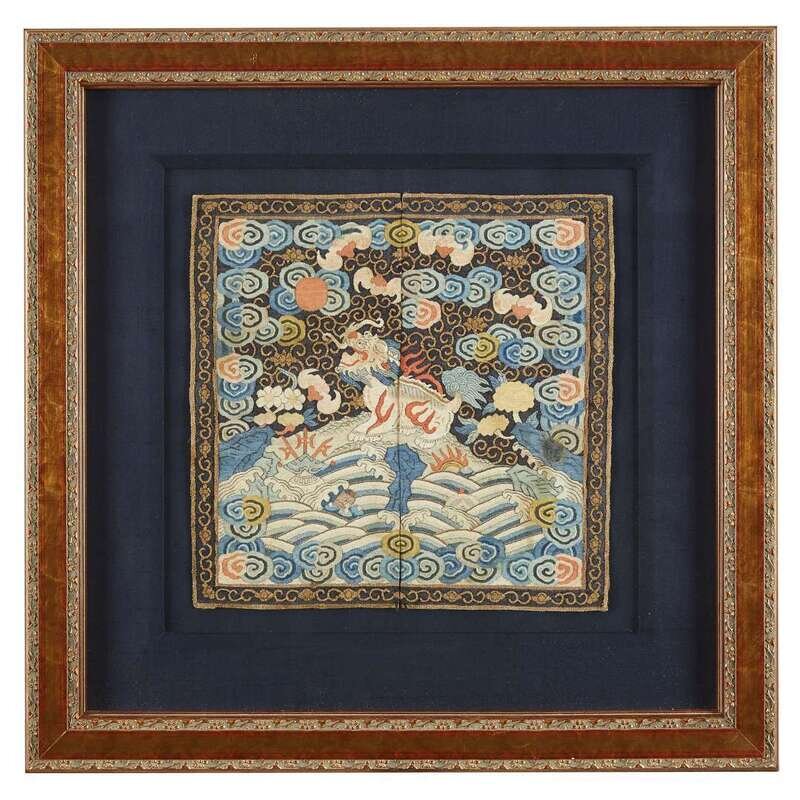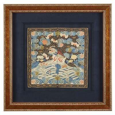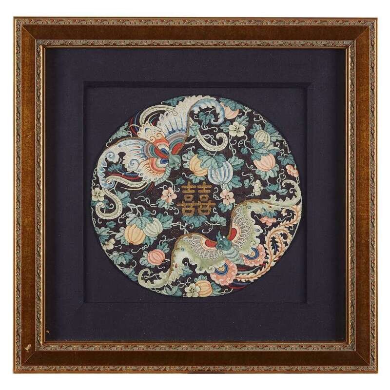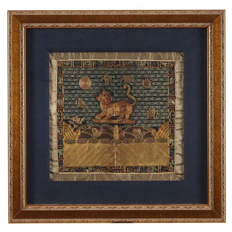 Comprising: A kesi tapestry censor's badge early 19th century H: 11 1/2 in., 29.2 cm; 11 3/4 in., 29.8 cm A couched gold and silver, silk embroidered and appliqued either a purchased second military rank 'lion' or a fourth military rank 'tiger' badge H: 13 in., 33 cm; W: 12 1/2 in., 31.8 cm A kesi tapestry 'shuangxi, butterflies and gourds' roundel circa 1840 D: 11 3/4 in., 29.8 cm.
