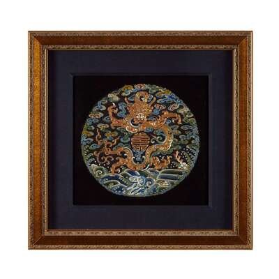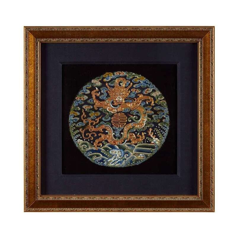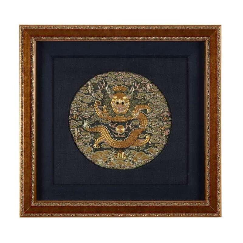 Comprising: A couched gold and silk embroidered imperial censor's 'two-clawed dragon' roundel circa 1788 D: 10 1/4 in., 26 cm A couched gold and silver imperial prince's 'five-clawed dragon' roundel Guangxu period (1875-1908) D: 10 1/2 in., 26.7 cm.