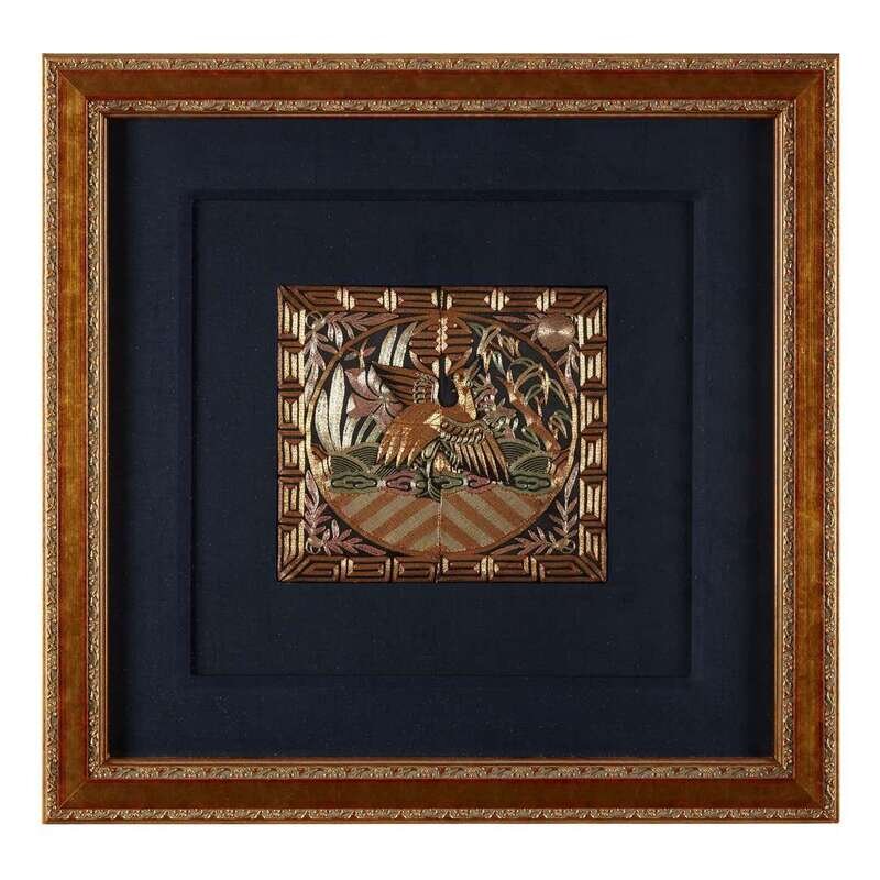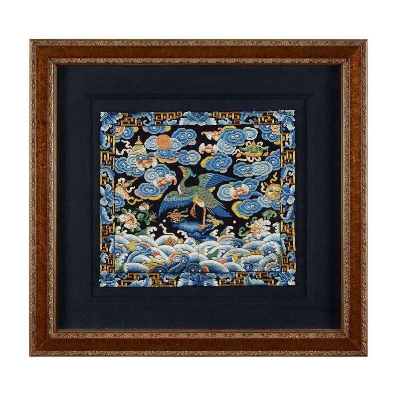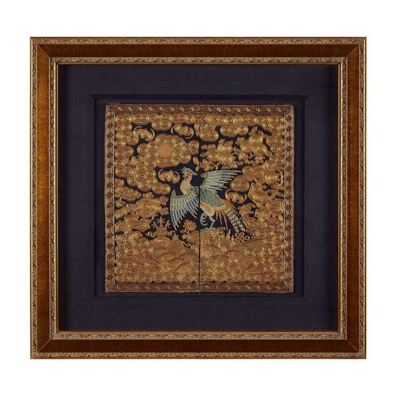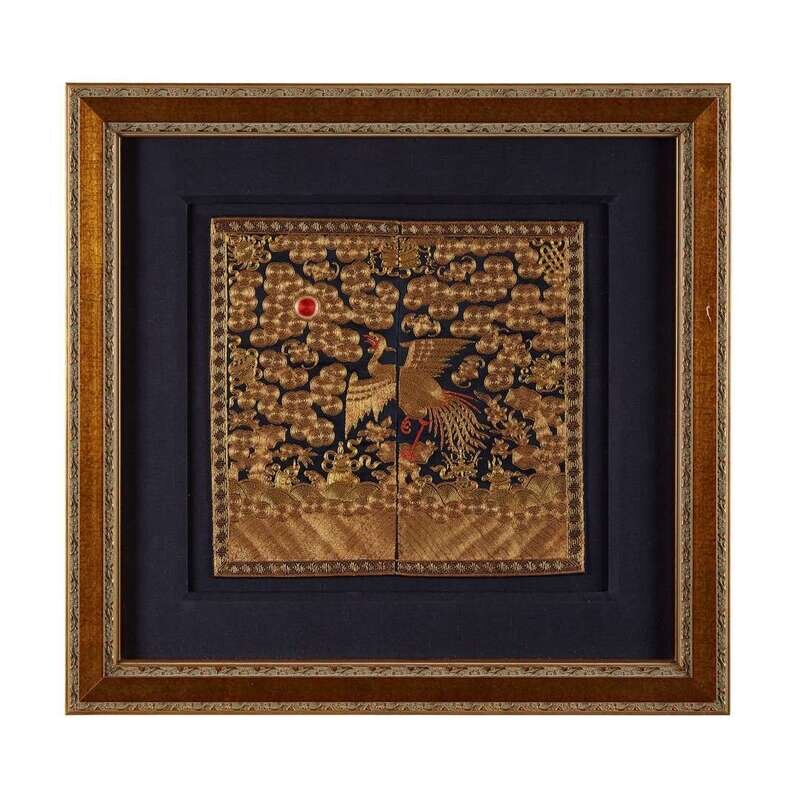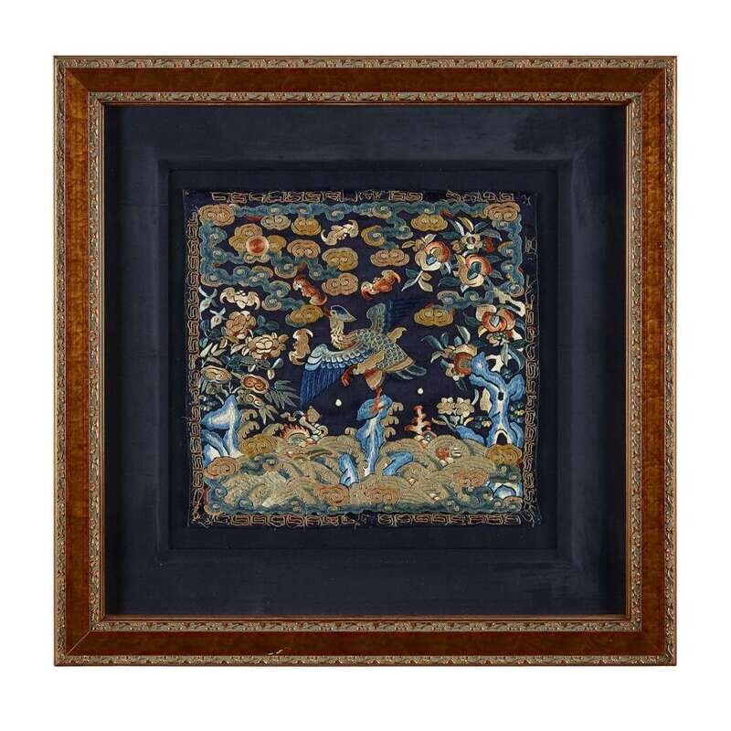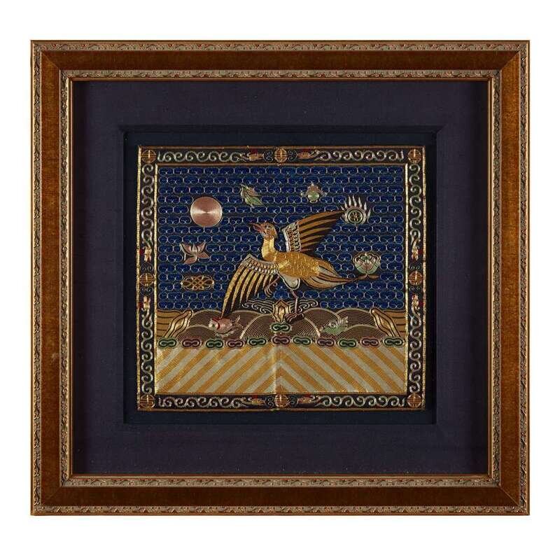 Comprising: A couched gold, silver and silk sixth civil rank 'quail' badge late 19th century H: 8 3/4 in., 22.2 cm; W: 8 in., 20.3 cm A silk embroidered seventh civil rank 'mandarin duck' badge 19th century H: 11 1/2 in., 29.2 cm; W: 11 1/2 in., 29.2 cm A couched gold and knotted silk embroidered second civil rank 'golden pheasant' badge 19th century H: 12 in., 30.5 cm; W: 12 in., 30.5 cm A couched gold, silver and silk embroidery and applique sixth civil rank 'egret' badge 19th/20th century H: 11 1/2 in., 29.2 cm; W: 12 in., 30.5 cm A couched gold and silk fifth civil rank 'silver pheasant' badge c. 1850 H: 11 1/2 in., 29.2 cm; W: 11 3/4 in., 29.8 cm A silk embroidered seventh civil rank 'mandarin duck' badge H: 11 1/4 in., 28.6 cm; W: 12 1/4 in., 31.1 cm.