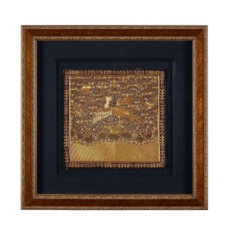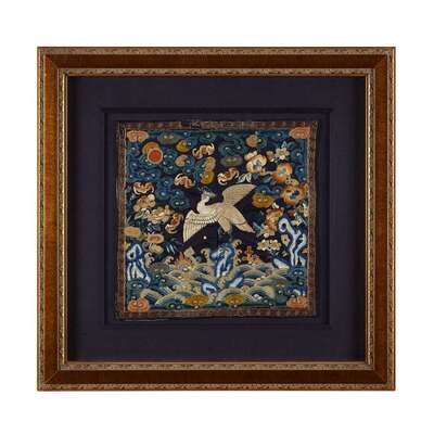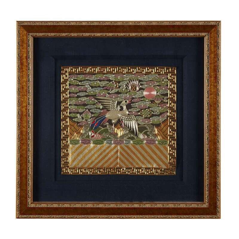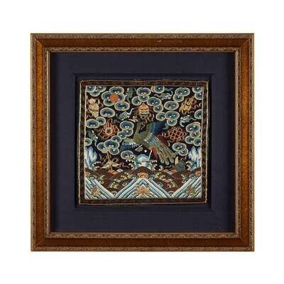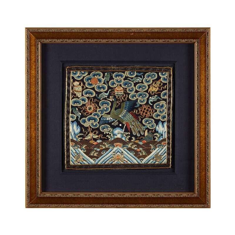 Comprising: A couched gold and silver embroidered third civil rank 'peacock' badge circa 1860 H: 11 1/4 in., 28.6 cm; W: 11 1/2 in., 29.2 cm A couched gold second civil rank 'golden pheasant' badge 19th century H: 11 in., 27.9 cm; W: 11 1/4 in., 28.6 cm A couched metalic thread and applique ninth civil rank 'paradise flycatcher' badge Guangxu period (1875-1908) c.1880 H: 11 1/2 in., 29.2 cm; W: 12 in., 30.5 cm A silk embroidered sixth civil rank 'egret' badge Guangxu period (1875-1908) H: 11 3/4 in., 29.8 cm; W: 11 3/4 in., 29.8 cm.