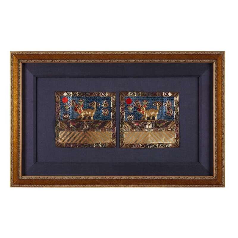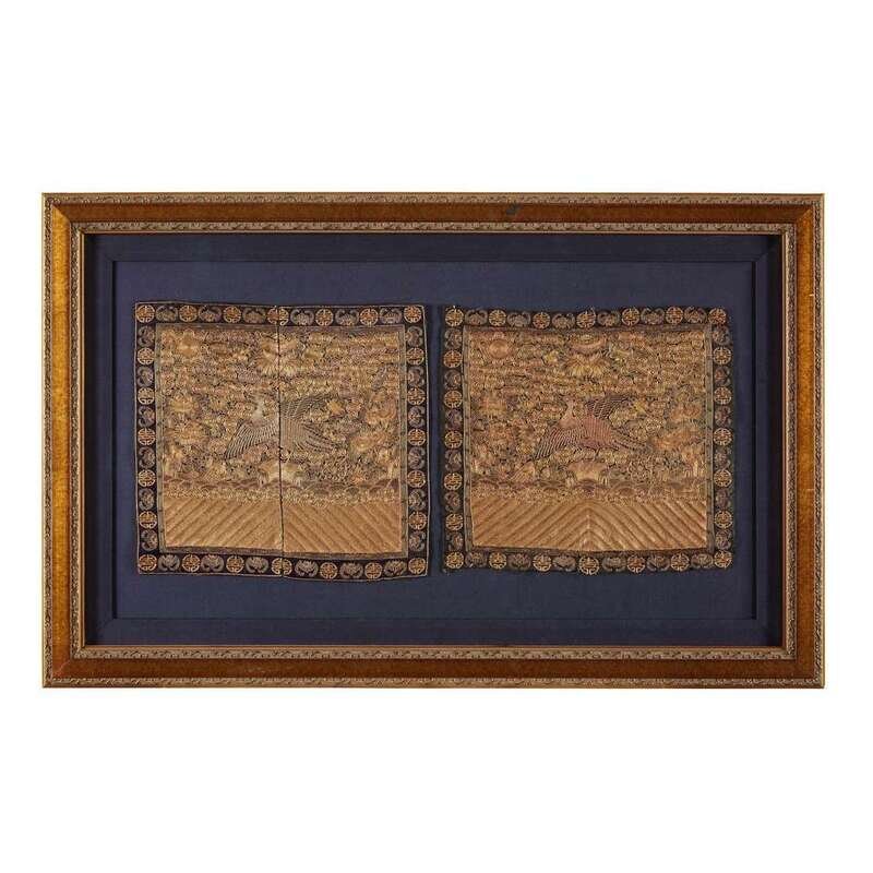Comprising: A pair of couched gold second civil rank 'golden pheasant' badges 19th century H of each: 12 1/8 in., 30.8 cm; W of each: 11 1/2 in., 29.2 cm A pair of couched gold and silk embroidered fourth military rank 'tiger' badges H of each: 9 in., 22.9 cm; W of each: 9 in., 22.9 cm A pair of couched gold, silver and silk second civil rank 'golden pheasant' badges 19th/early 20th century H of each: 9 1/2 in., 24.1 cm; W of each: 10 in., 25.4 cm.