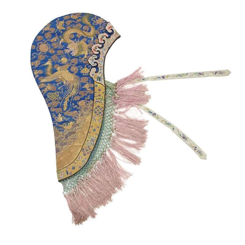 A Chinese embroidered silk hood with tassels, fengguo