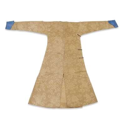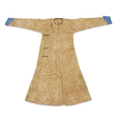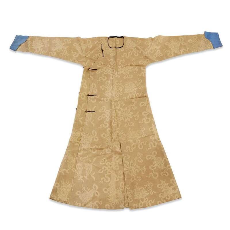 The gauze woven with eight Buddhist symbols, light blue silk horseshoe cuffs.
