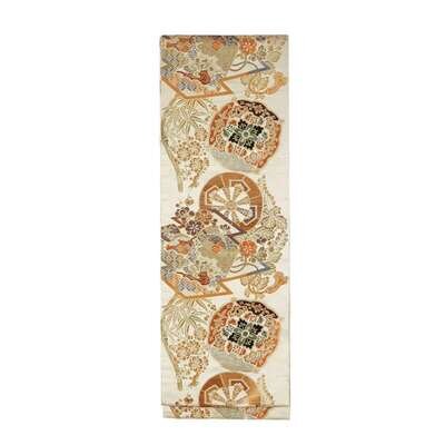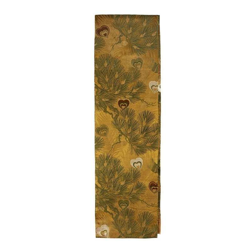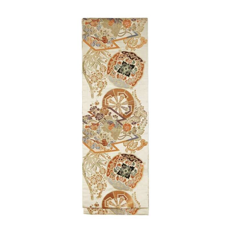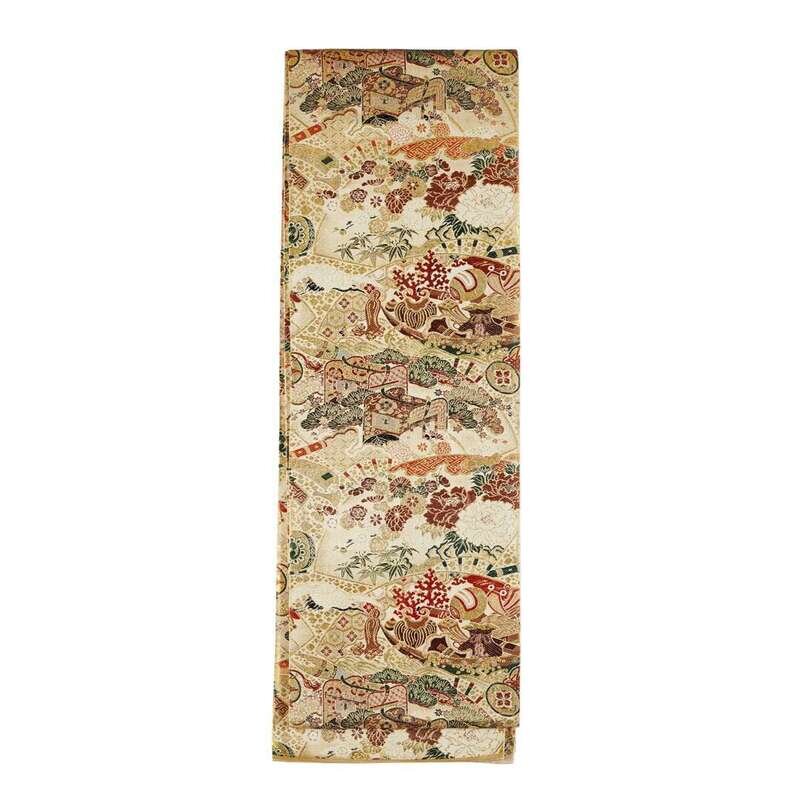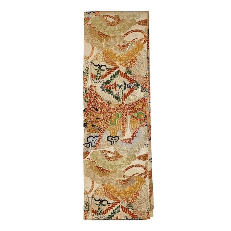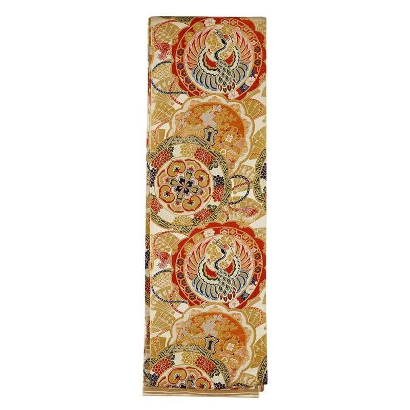 Of heavy gold brocade, comprising one with crane, pine and diaper; one with peacock feathers and pine; one with roundels, flower sprays and bamboo; one depicting crane roundels; the last obi with chrysanthemum.