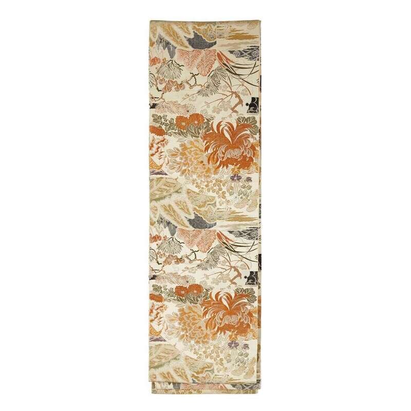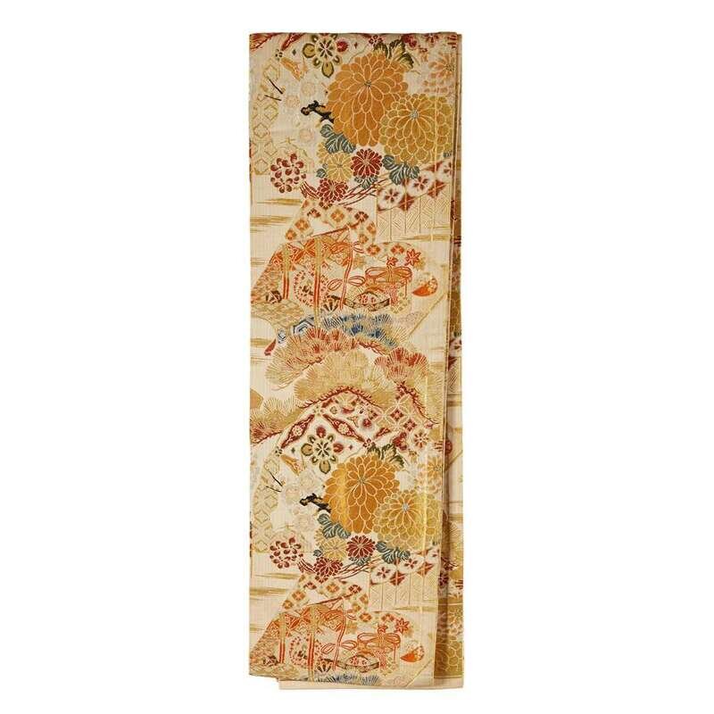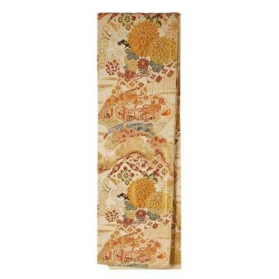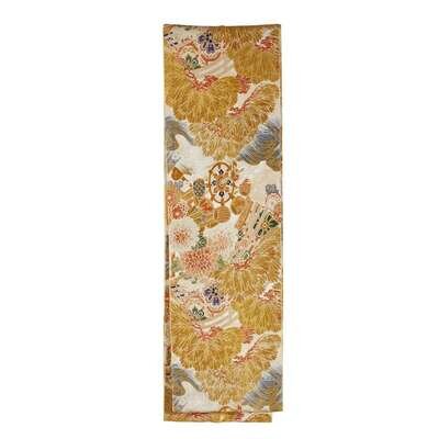 Of heavy gold brocade, one depicting boxes, chrysanthemum and pine; the second with a bridge, pine and diaper; the last depicting flowers and pine.