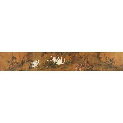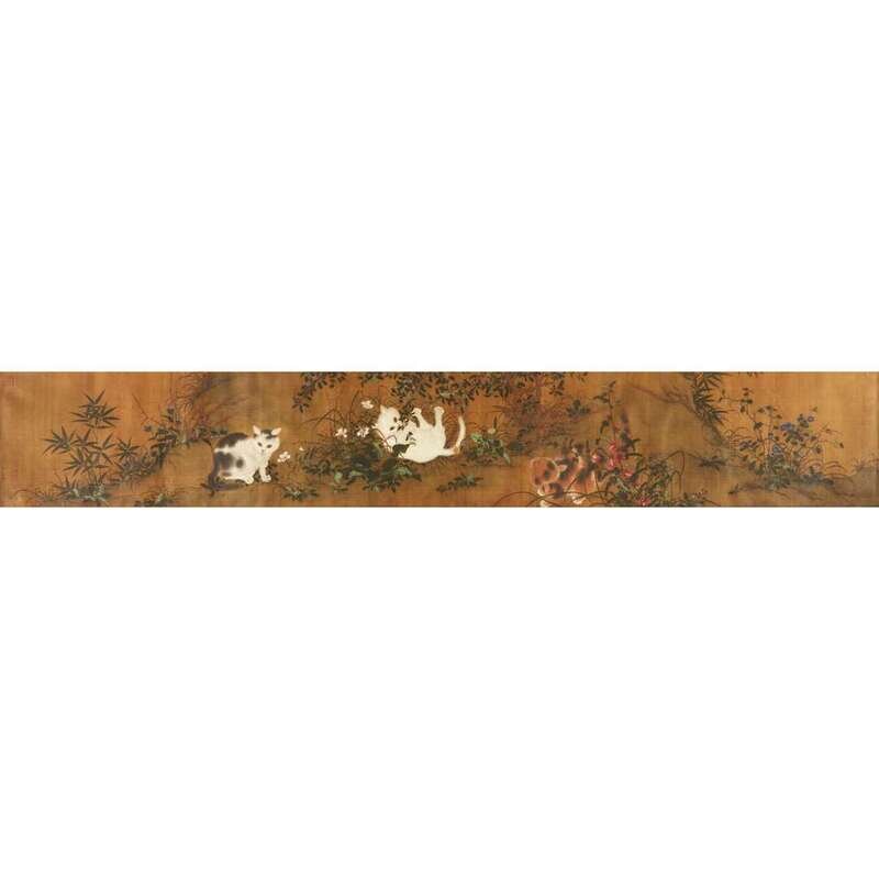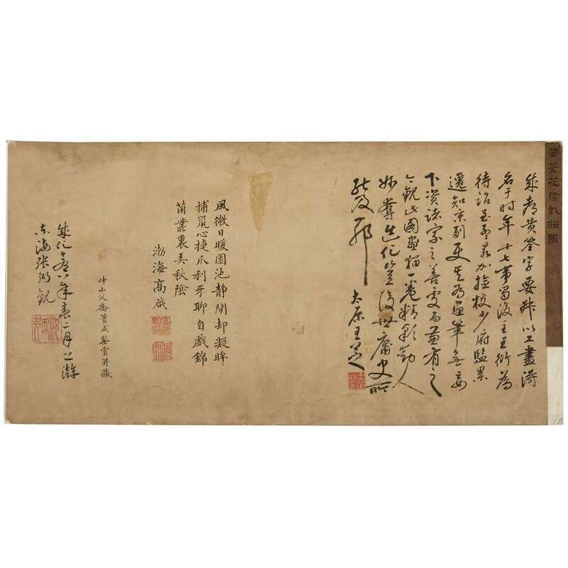 Ink and color on silk, hand scroll, bearing signature 'shu ren huang quan' at lower left corner and six seals, together with a separate unframed end section with four collophon inscriptions, and seals. sight H: 11 3/4 in., 29.8 cm; W: 78 1/4 in., 198.8 cm
