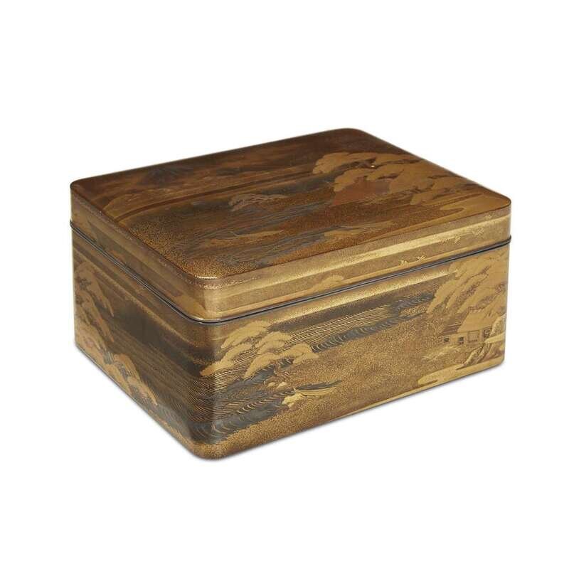 Finely decorated depicting cottages, boats, fish and nets, along the shore, Mount Fuji in the distance.