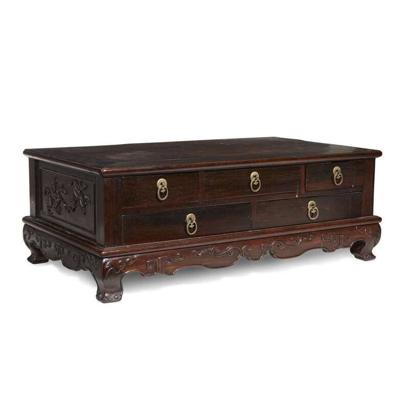 With three drawers over two drawers, scroll and bird mask carved base, the sides carved with peaches, the table possibly assembled of older elements.