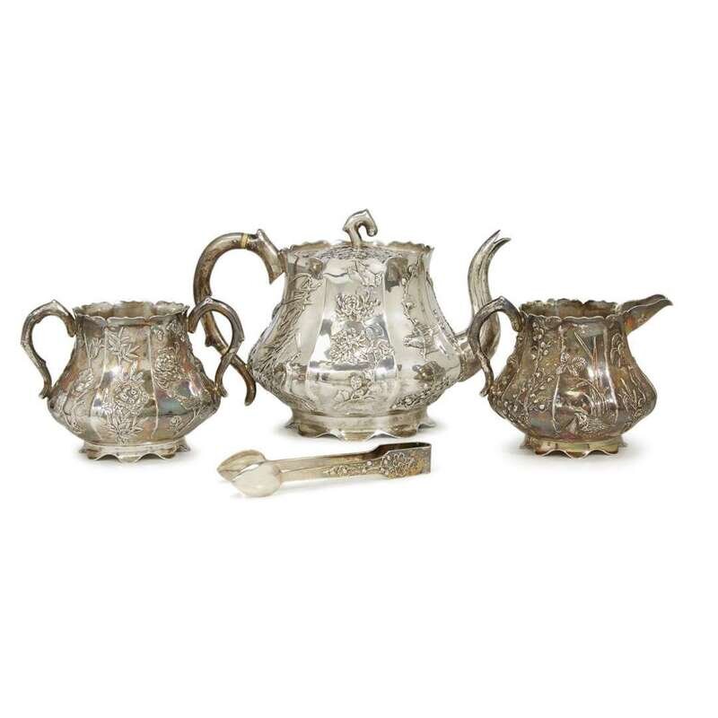 Comprising a teapot, a creamer, a sugar, and a pair of unmarked sugar tongs.