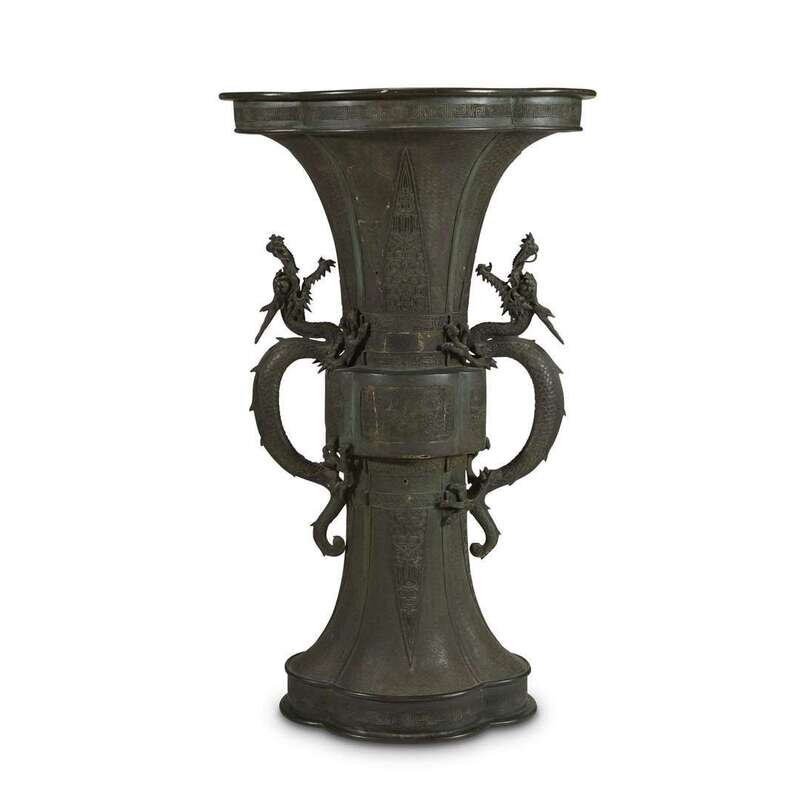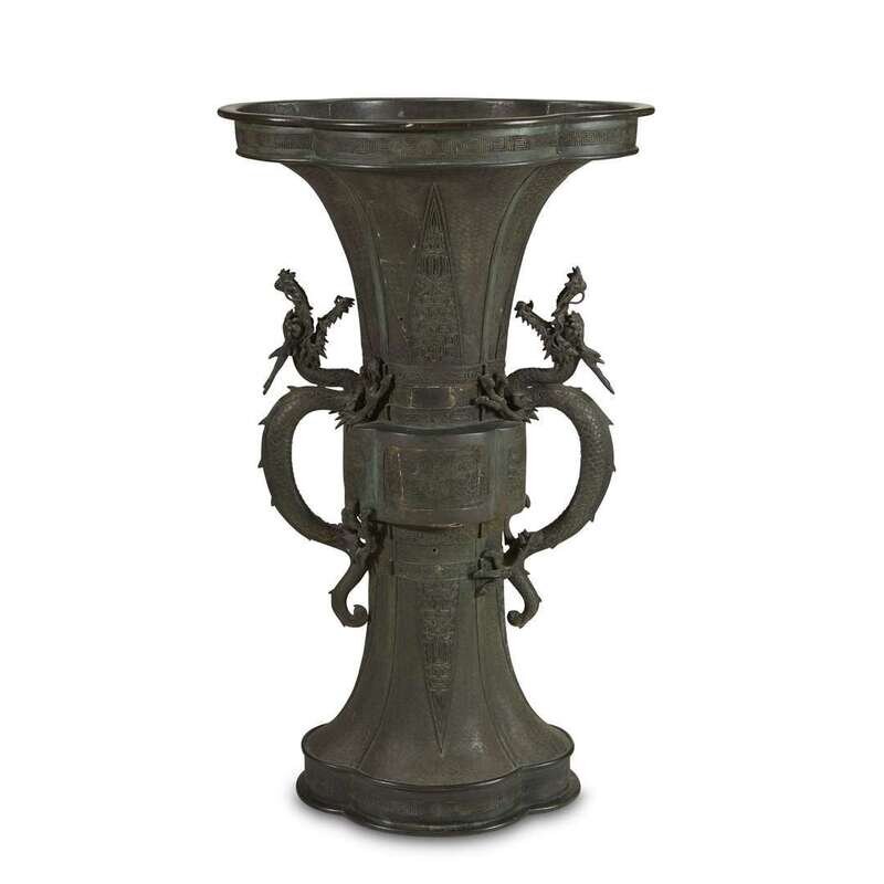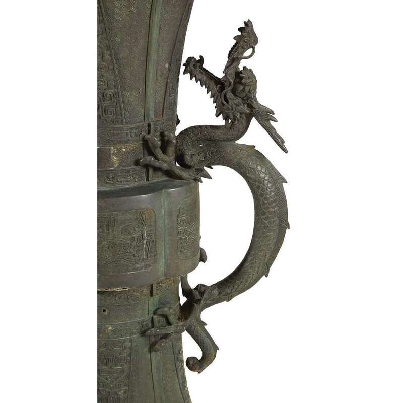 A massive Japanese patinated bronze Gu-form vase with dragon handles meiji period