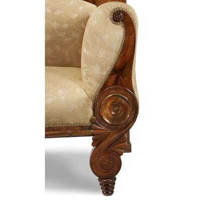 The rectangular back with feather-form volutes supporting a turned rod above the veneered walnut frame issuing scrolling arms on a rectangular base supported by scrolling feathered volutes on turned toupie feet.