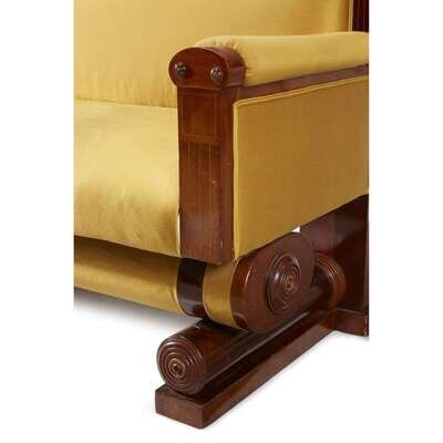 The rectangular upholstered back framed by a moulded and inlaid surround issuing rounded rectangular armrests similarly inlaid; the rectangular seat above an oblong upholstered ottoman base banded and ended in mahogany, above three round supports with turned ends on conforming rectangular plinths.