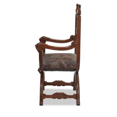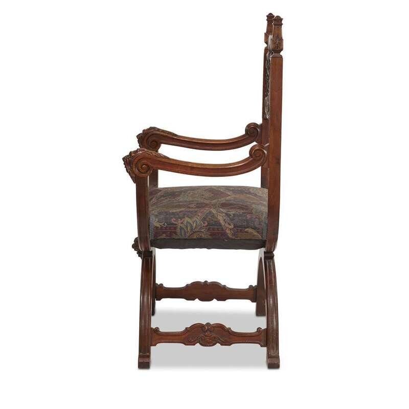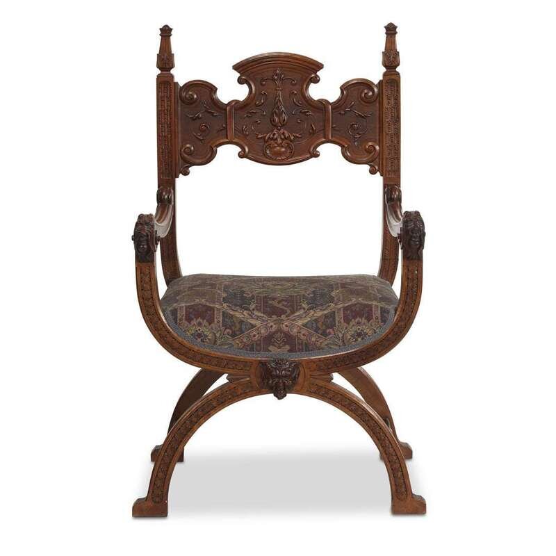 Of typical form, the shaped backrest with carved grotesque decoration between two finial-topped uprights issuing curved masque-headed armrests above a curved seat with curule legs on paw feet.