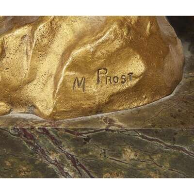 Gilt bronze, signed in cast "M. PROST;" raised on marble base.