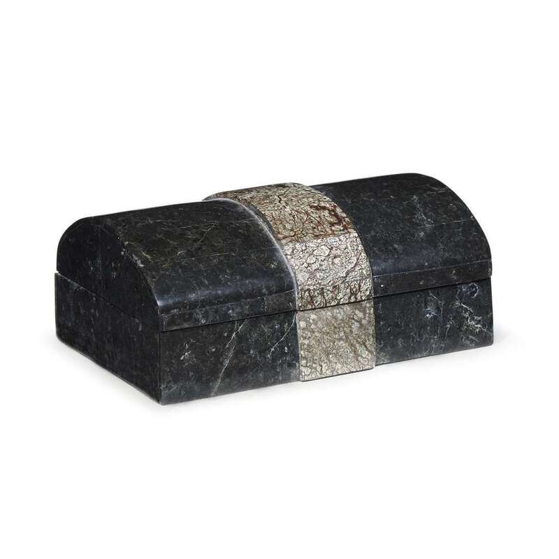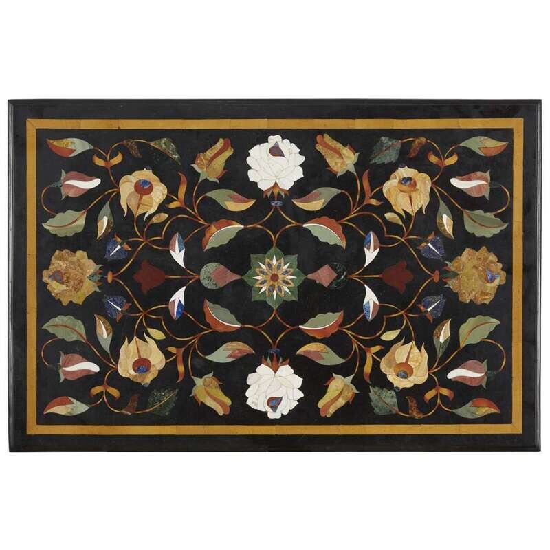 Rectangular with moulded edge, the black marble substrate inset with various specimen marbles in a geometric floral motif; sold together with a specimen marble mosaic veneered trinket box. (2).