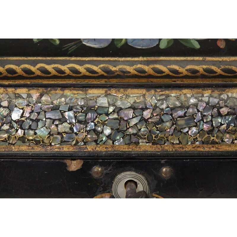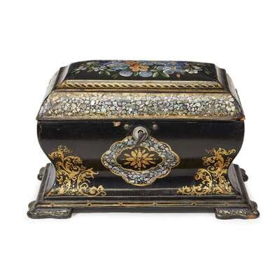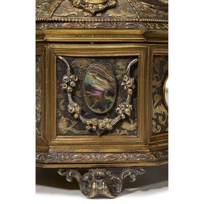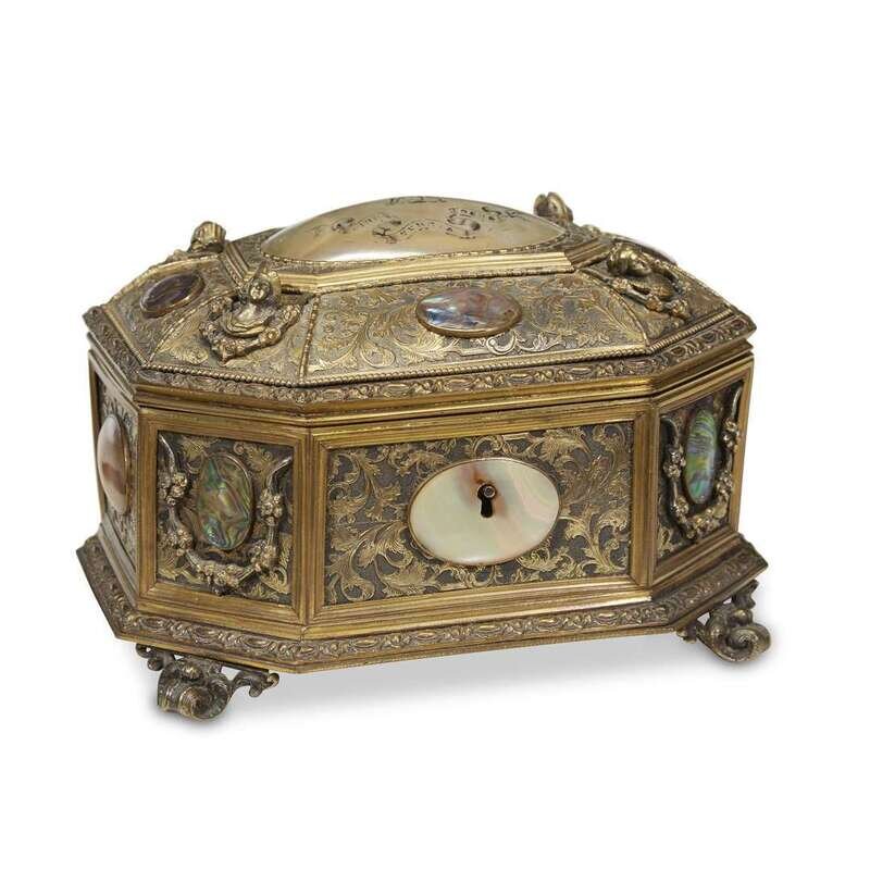 The first a Renaissance Revival gilt-bronze footed box mounted with mother-of-pearl medallions and inscribed with memorial for Prince Albert, together with a Victorian parcel-gilt and mother-of-pearl inlaid black lacquer box. (2).